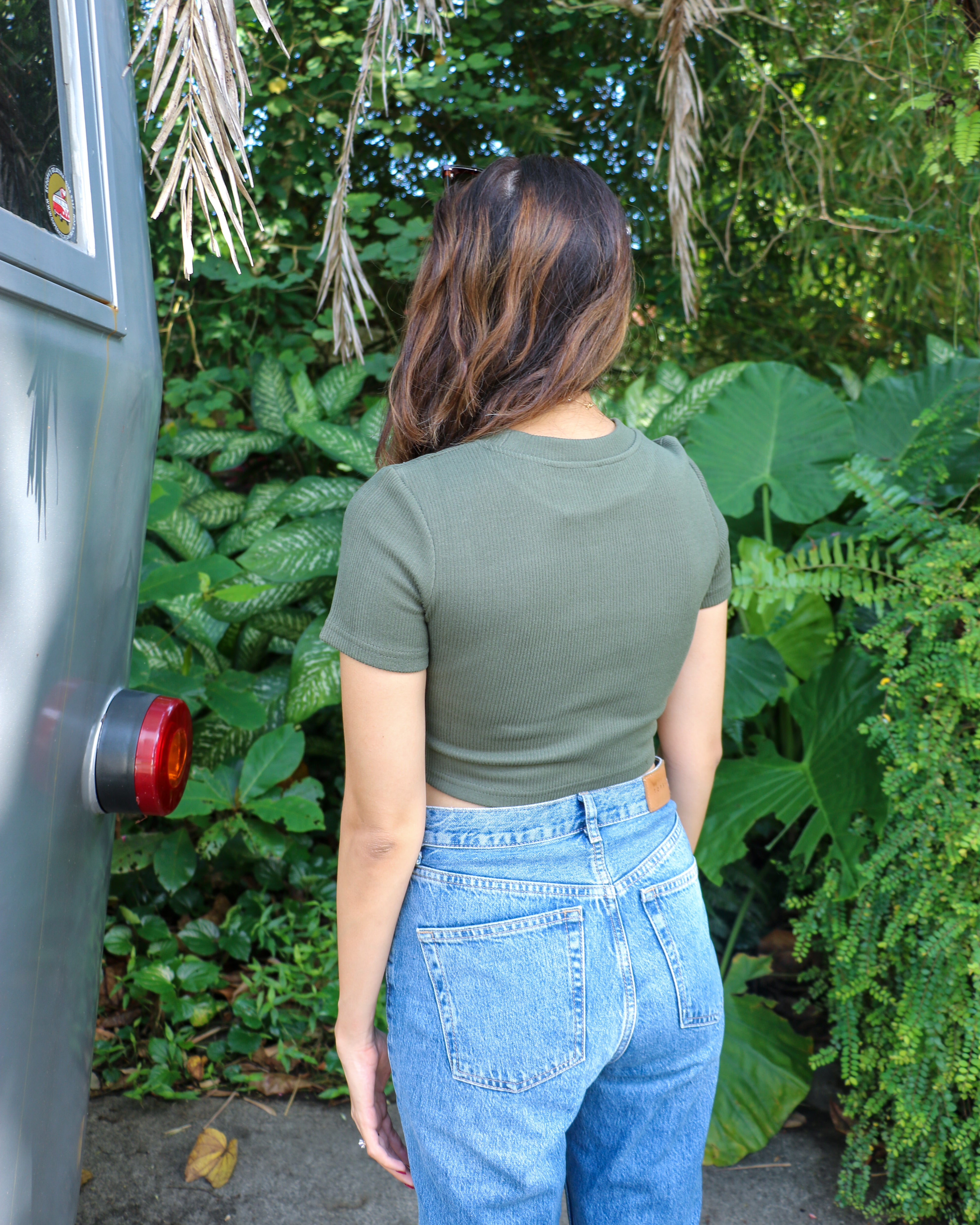 Size M measures 15" PTP, 13" waist, 14.5" down.